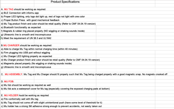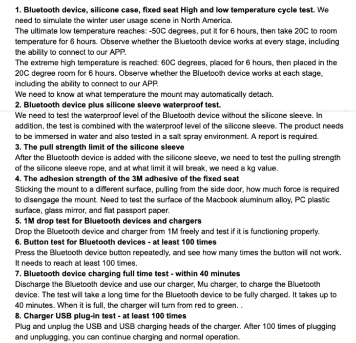 Our Mu tag and Mu charger’s bluetooth functionality and charging functionality have been tested respectively. During our engineering prototypes reliability testing phase, we gave this list requirements to our manufacturer.